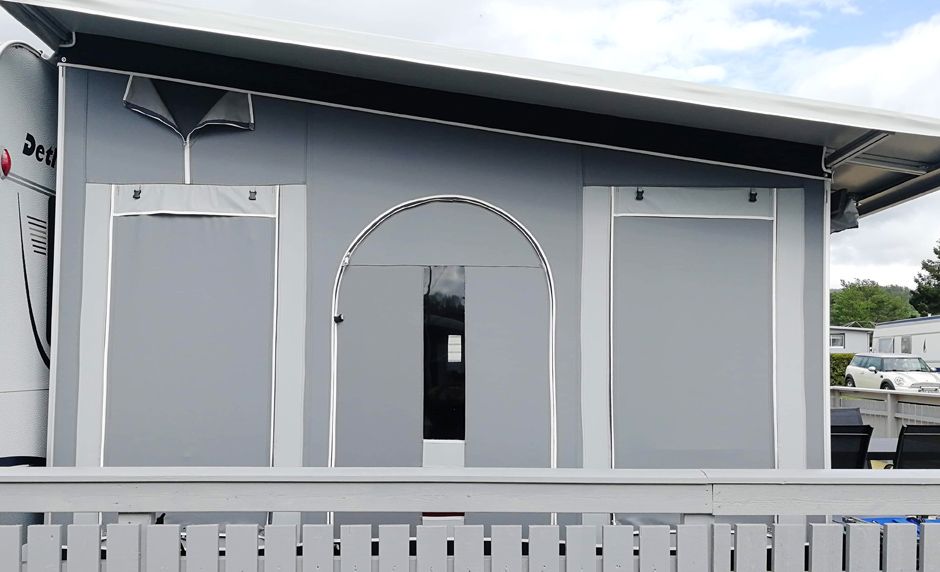 Tack vare konstruktionen kan tältet vara något bredare än husvagnen, och tätningskuddar ser till att anslutningen mot vagnen blir tät.