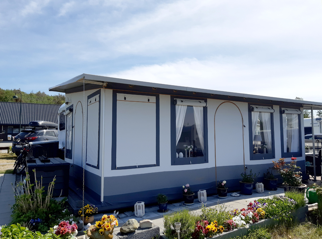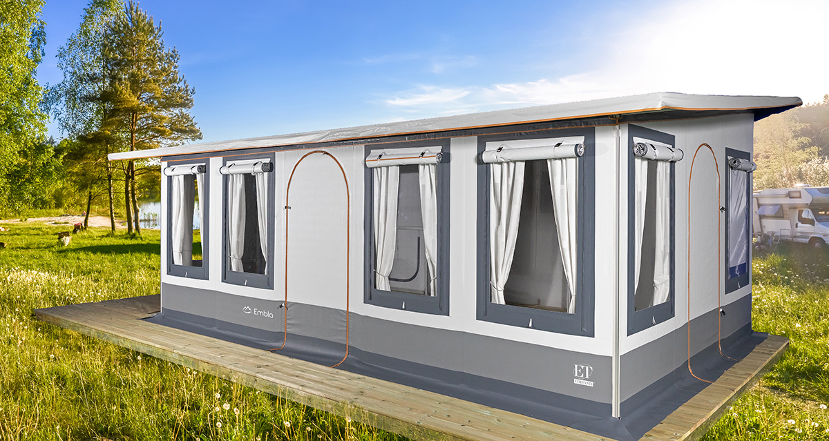 Tältet monteras tätt mot husvagnen utan sluss, vilket ger ett enhetligt utseende och maximalt utrymme invändigt.