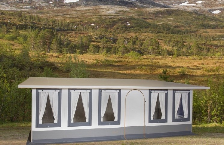 Tältet monteras tätt mot husvagnen utan sluss, vilket ger ett enhetligt utseende och maximalt utrymme invändigt.