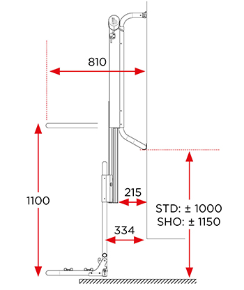 Bike-Lift Standard Rail rekommenderas för vertikala väggar med monteringsmått 980-1360 mm.