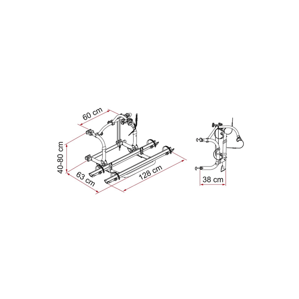 Den är designad för 2 cyklar, både elcyklar och vanliga cyklar, och kan utökas till 4 cyklar med kompletteringssatser. Konstruktionen består av runda aluminiumrör med 15 micron eloxering, dubbelt förstärkta skenor samt ett system som dämpar stötar och vibrationer under körning. Alla fästelement är rostfria för lång livslängd.