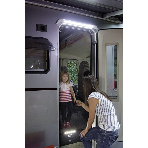 Ge din husbil eller husvagn en praktisk och elegant uppgradering med denna LED-belysning med inbyggd regnränna. Den är särskilt utformad för montering ovanför entrédörren och kombinerar effektiv belysning med ett smart skydd mot regnvatten.