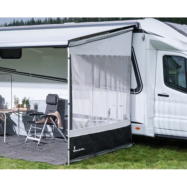Skapa en behaglig och skyddad uteplats framför din husvagn, husbil eller van med Isabella Shade Side. Detta sidostycke är enkelt att montera på markiser med ett djup på 250 cm och passar fordon med en höjd på 245–270 cm. Med ett djup på 240 cm förlänger det effektivt din utomhusyta och ger både solskydd och lä.