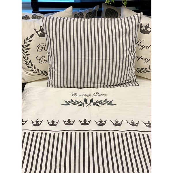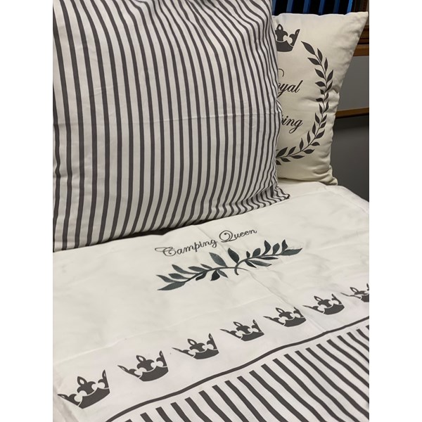 Bäddset i 100% bomullssatin bestående av örngott och påslakan. Mjuka och behagliga påslakan som känns sköna mot hud och ger en extra ”lyx- och hemmakänsla” i husbil och husvagn vart man än befinner sig! Vitt påslakan och örngott med grå linjer. Camping King och Queen är broderat.