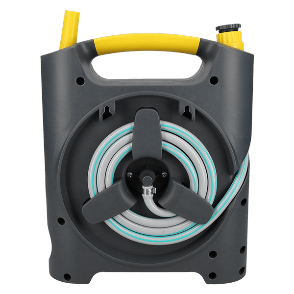 En praktisk slangvinda med 11,5 m vattenslang (10 m vattenslang + 1,5 m kopplingsslang) vilket ger gott om räckvidd. Den är designad för bekvämlighet och är lätt att bära tack vare ett ergonomiskt handtag. Krokar på baksidan kan användas för smidig väggmontering. AquaFlow har en snabb och okomplicerad rullfunktion vilket säkerställer att in- / utrullning av slangen går såväl smidigt som effektivt. Vattenflödet kan slås på och av med ett justerbart munstycke.