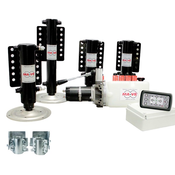 MA-VE-systemet använder en elektrohydraulisk 12 V-pump som snabbt och effektivt reglerar stödbenen. För extra trygghet finns även en manuell säkerhetspump som gör det möjligt att fälla in benen om den elektriska hydrauliken skulle fallera.