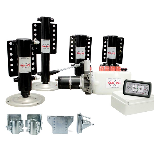 MA-VE använder en elektrohydraulisk 12V-pump som driver stödbenen snabbt och effektivt. Skulle den ordinarie hydrauliken av någon anledning fallera finns även en säkerhetspump som gör det möjligt att fälla in benen manuellt, vilket ger extra trygghet vid driftstörningar.