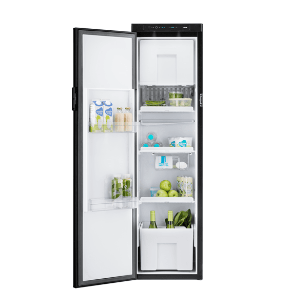 Slimmad design med stor volym – endast 418 mm bred, men med totalt 142 liter inklusive frys på 15 liter. Kylskåpet har integrerad flasklåda, LCD-pekskärm och garanterar konstant optimal temperatur oavsett energikälla.